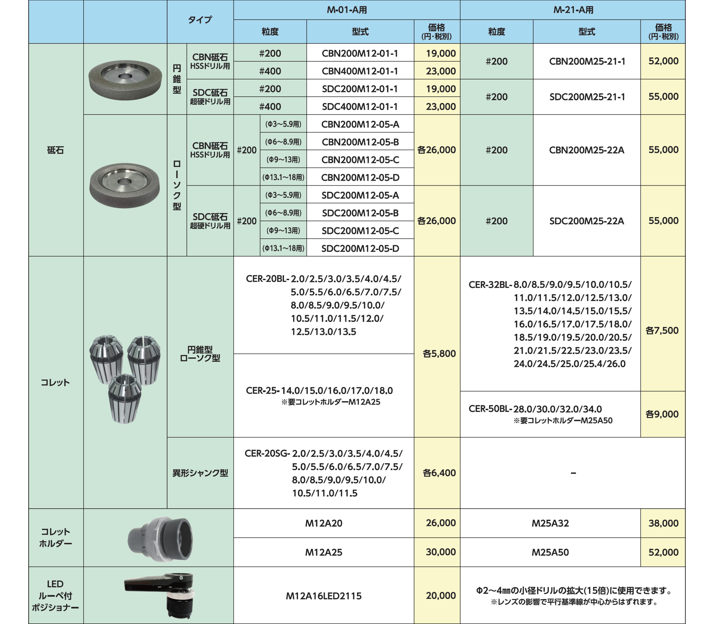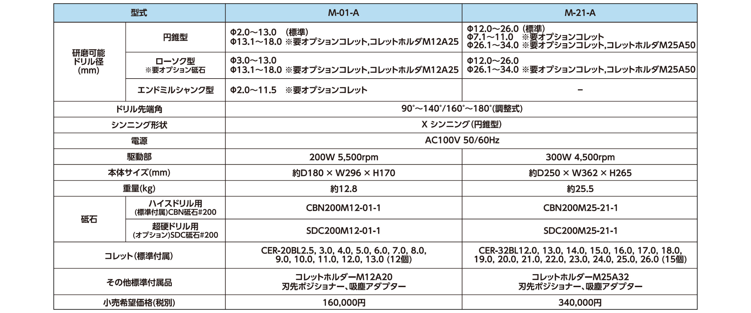 - コレットやコレットホルダー(オプション)を追加することで、大径やエンドミルシャンクドリルの再研磨も可能です。