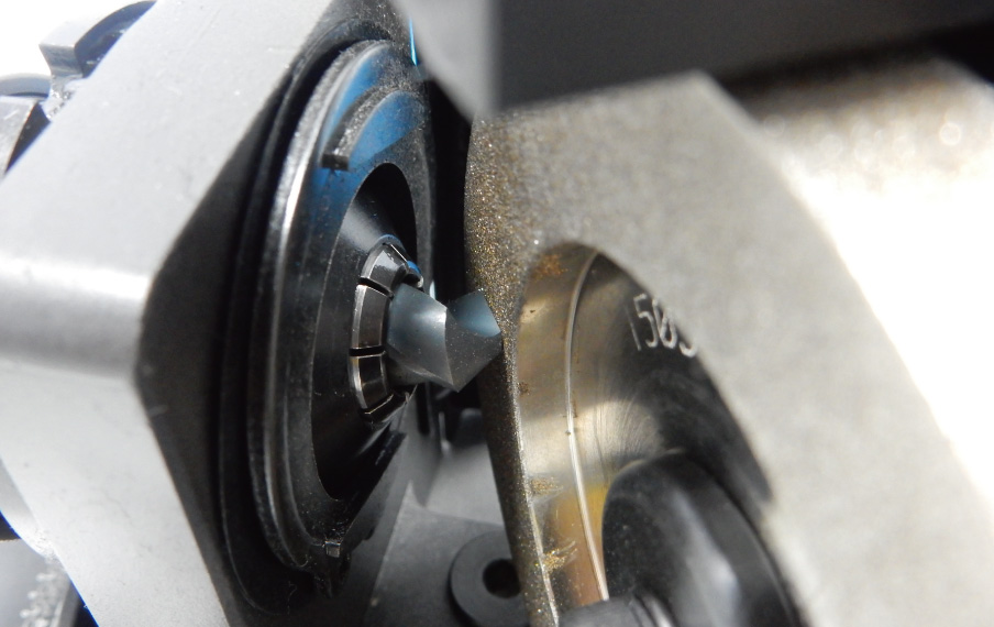 対して本機は、砥石の「平面」で研磨する平面研磨方式により刃先を平面に仕上げることで、刃先強度を高め、工具寿命の延長を可能にしました。
