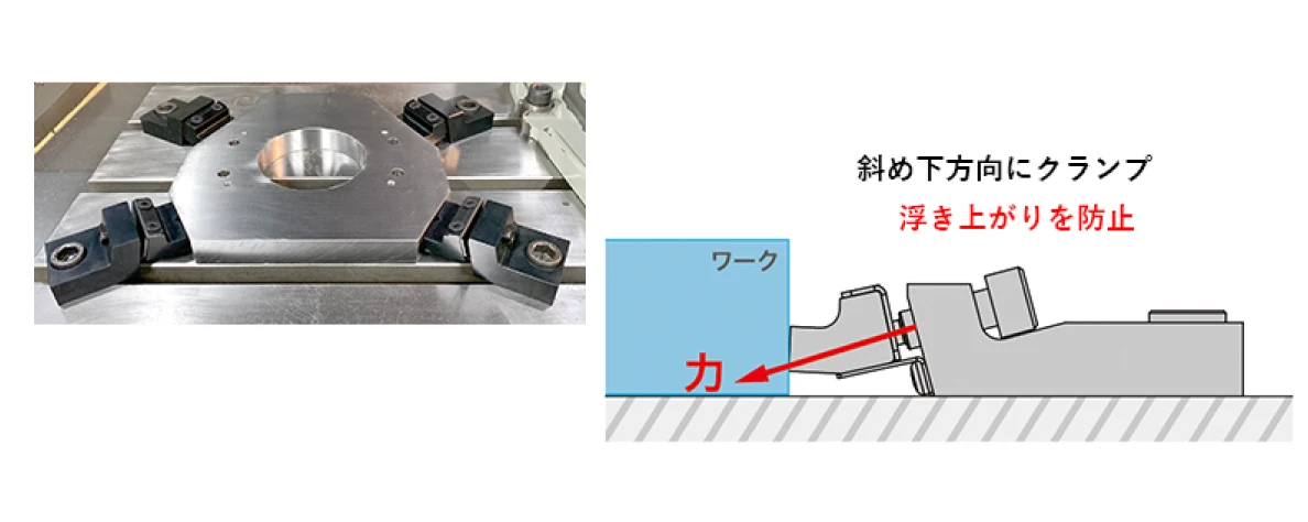 - 上から押さえると刃物が干渉する場合、側面からがっちりクランプし、浮き上がりを抑えます。