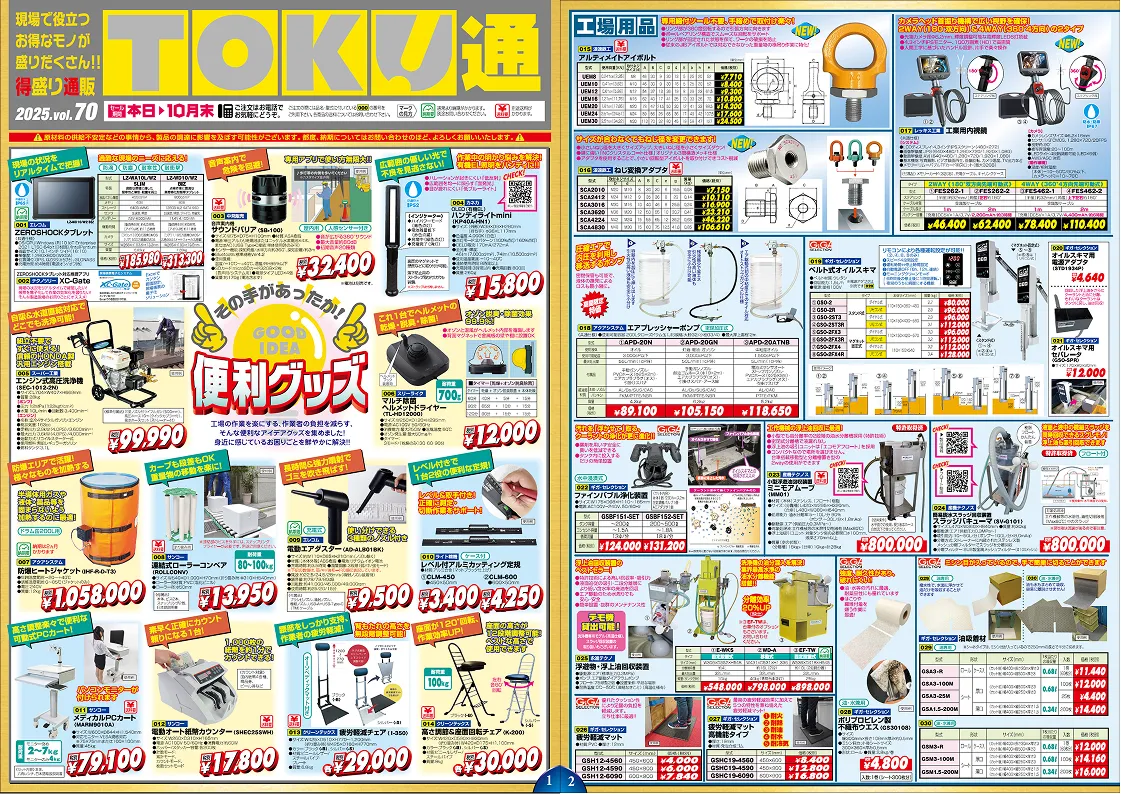 製造現場で使用する専用機器から工業用副資材に至るまで幅広い製品を集めた通販型チラシです。季節商品や消耗品などもキャンペーン価格でご提供。